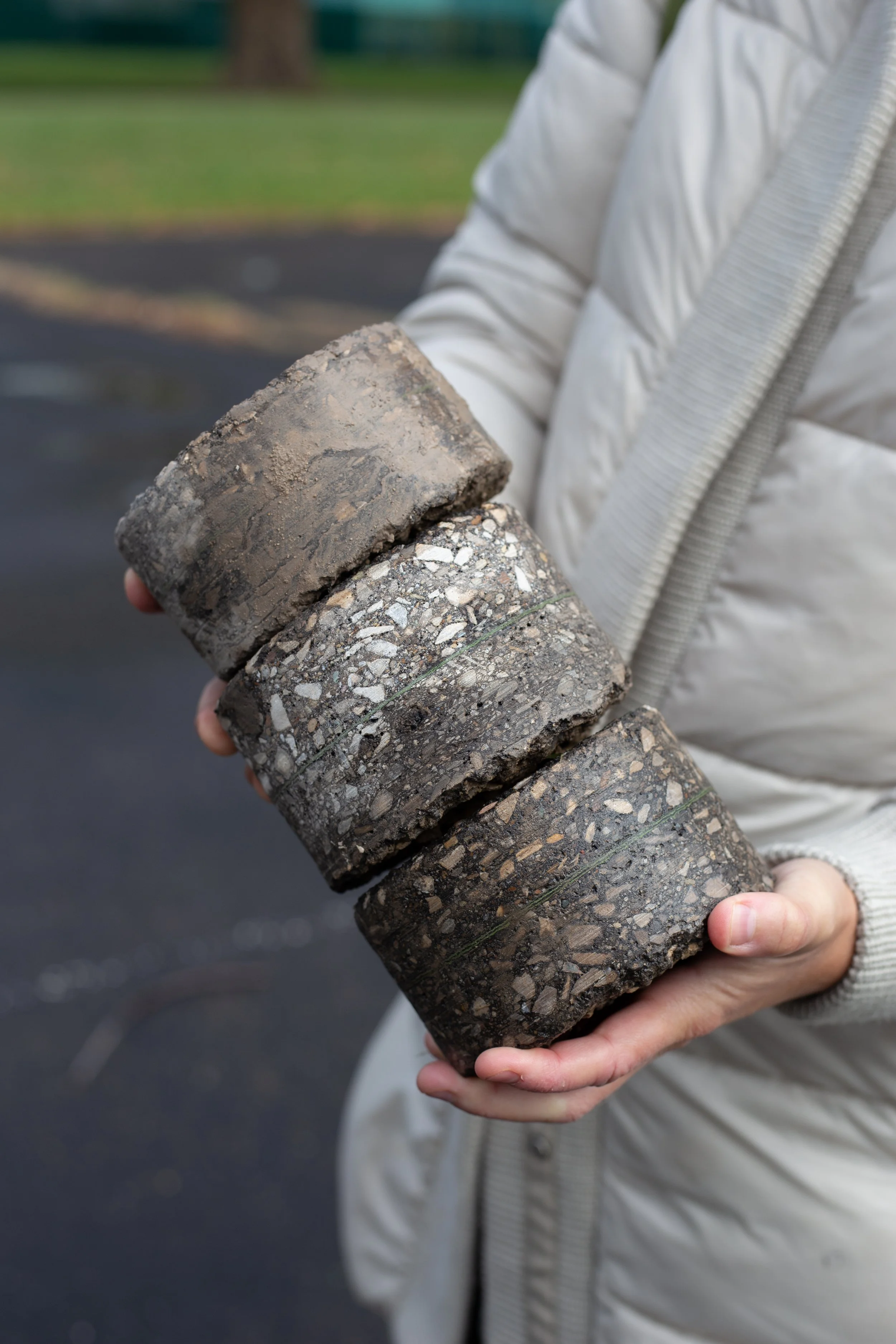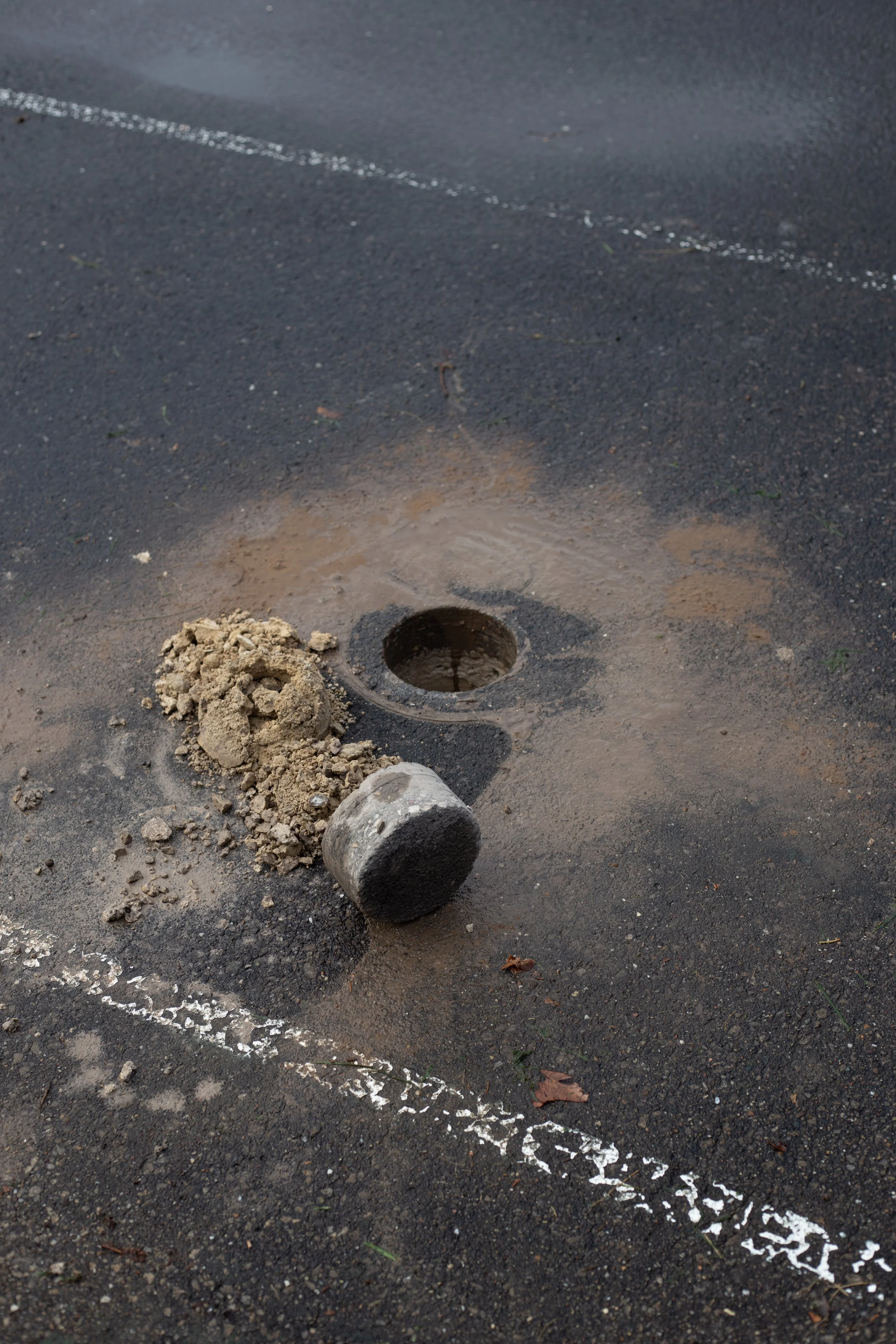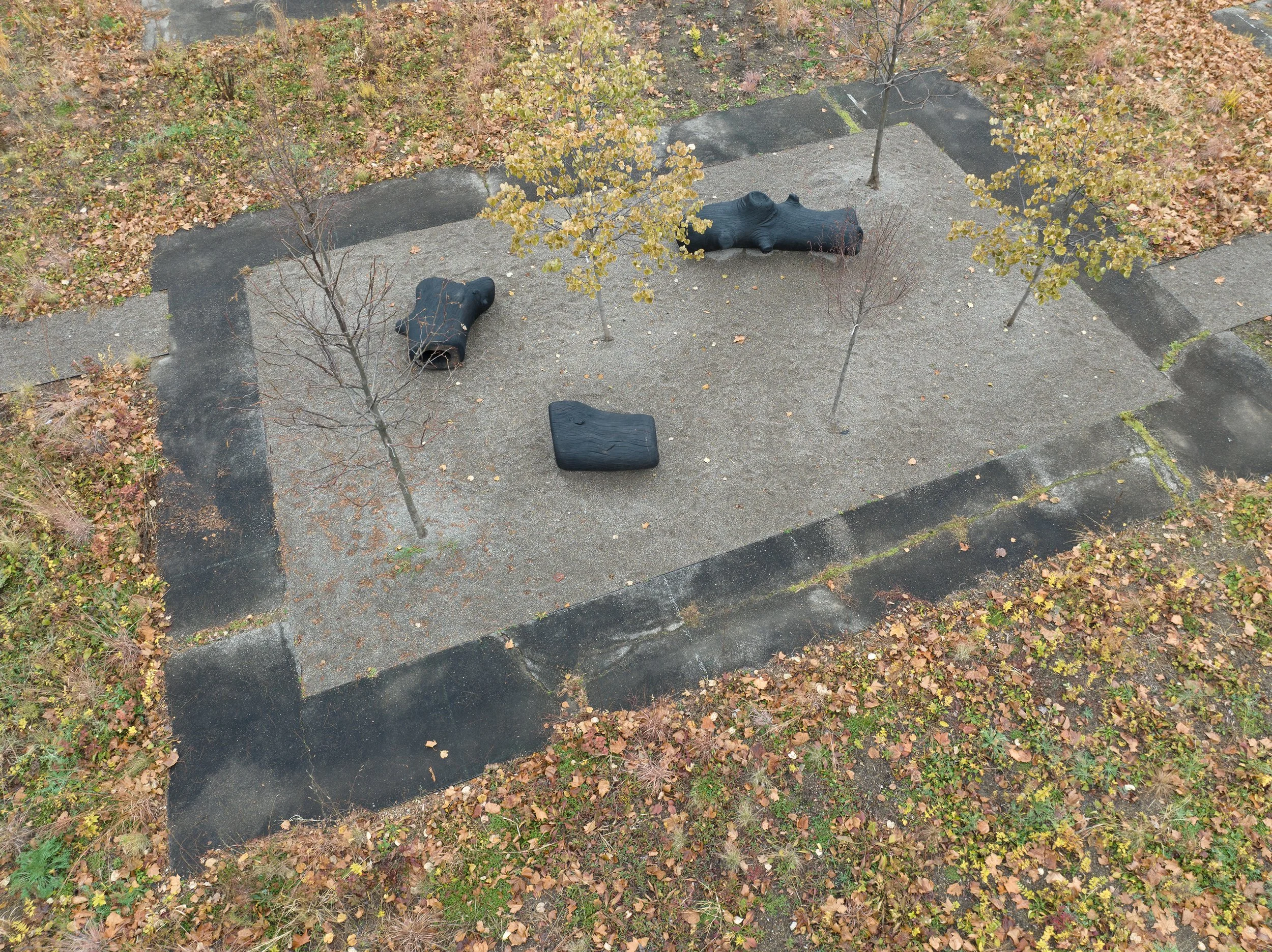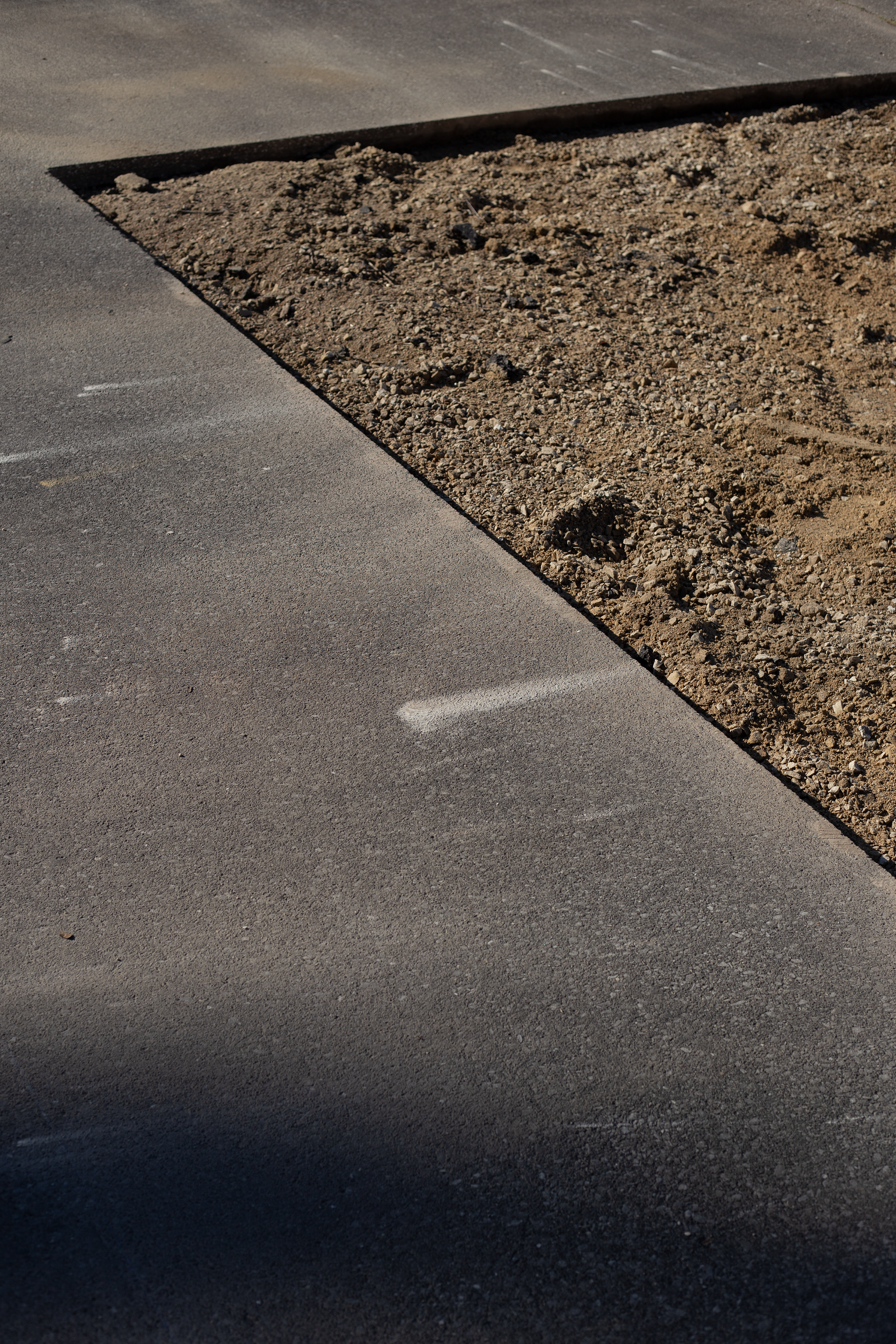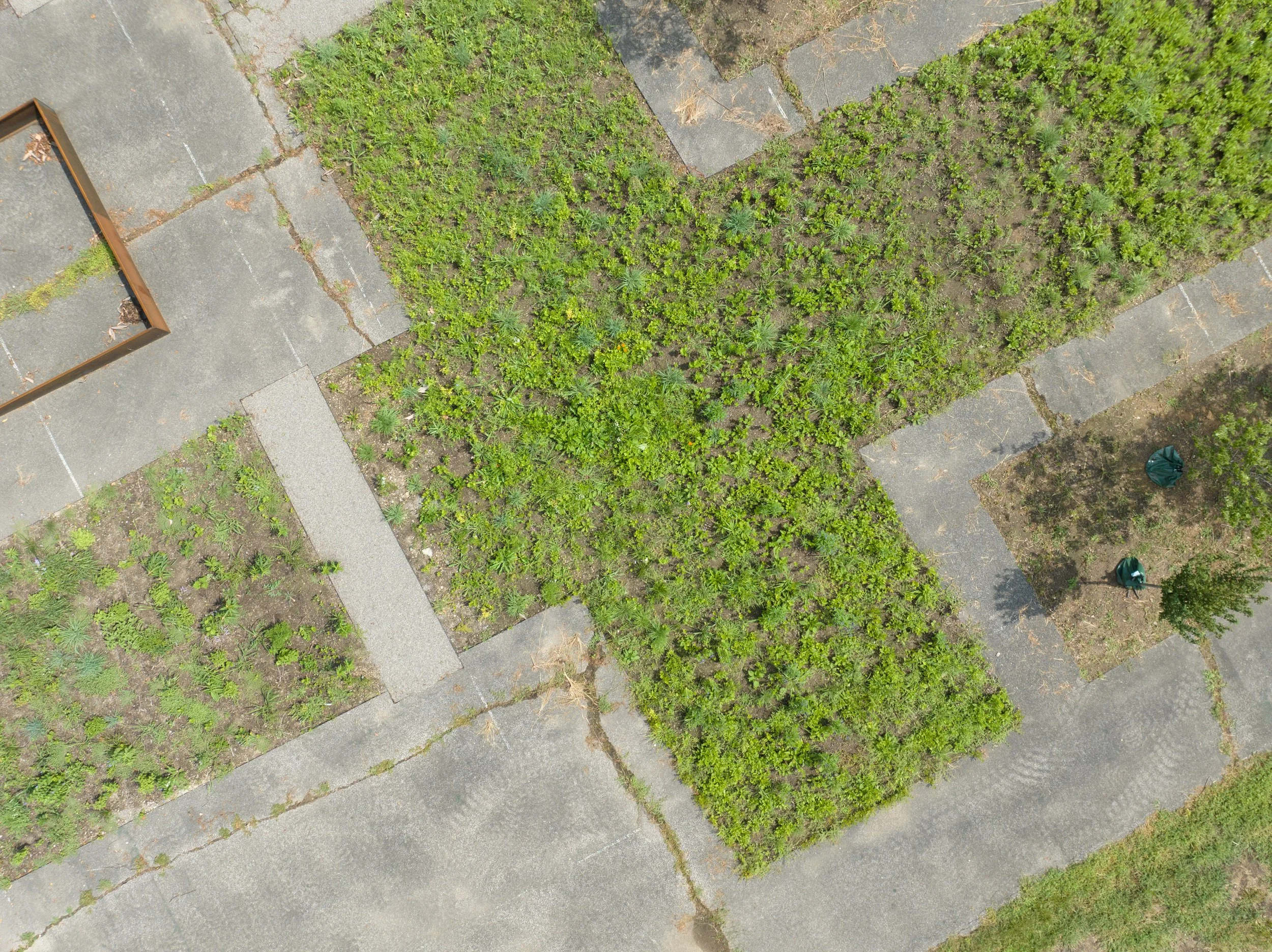 Four eighteen-foot wide swathes of prairie plants carve an unloved half-acre asphalt site into nine rooms: four gravel bosques, three corner rooms with charred wood seating and sculpture, and two spaces holding experimental planters filled with excavated asphalt, soil, and ruderal plant species.