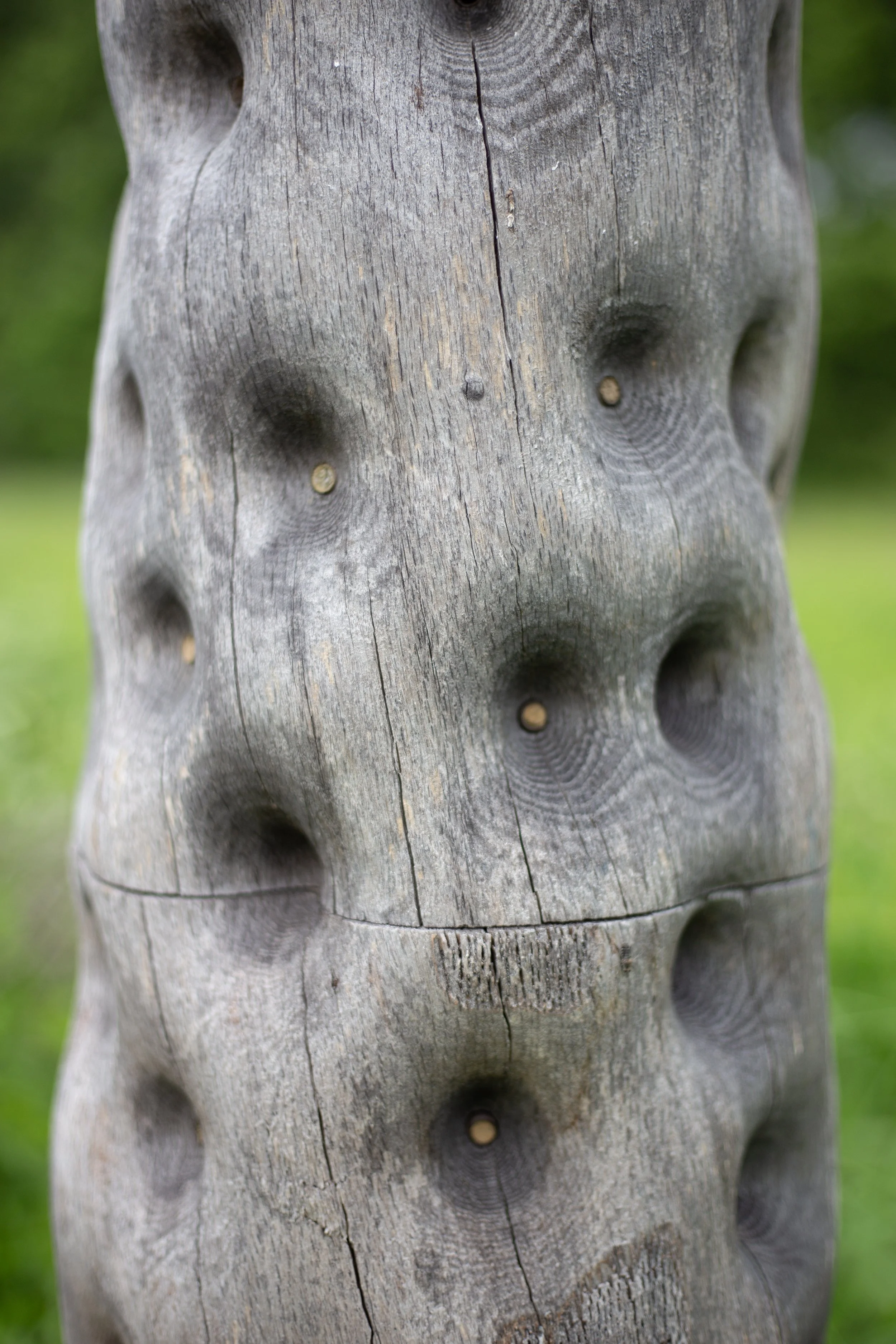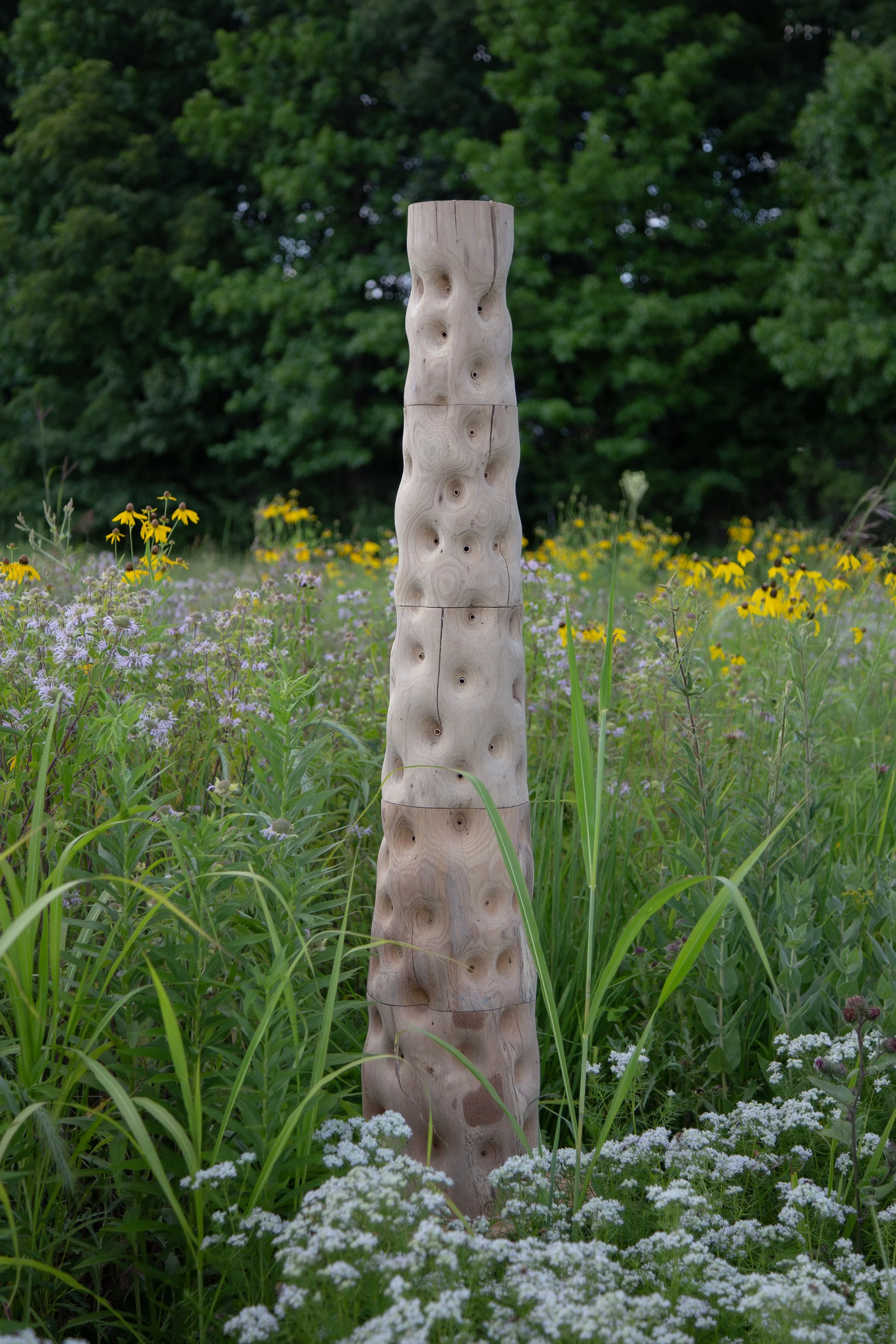 Pollinator Column is a sculpture that hums, a functional art piece shaped by the habitat needs of solitary bees. Solitary bees make up more than 90% of North America’s 3,600 native bee species. They live in the ground, in plant stems, and in the cracks of rocks and dead trees. Soil degradation, pesticide use, habitat fragmentation and an intolerance for deadwood in parks and public spaces has led to population declines in bee communities. Pollinator Column upcycles fallen wood into hyper-dense habitat, providing over 150 cavities for nesting bees and larvae.